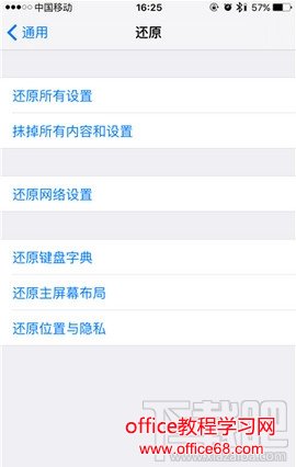 二:进入iPhone【通用】设置后,再进入【还原】设置,在还原设置中点击进入【还原所有设置】或者【抹掉所有内容和设置】设置,如下图所示。