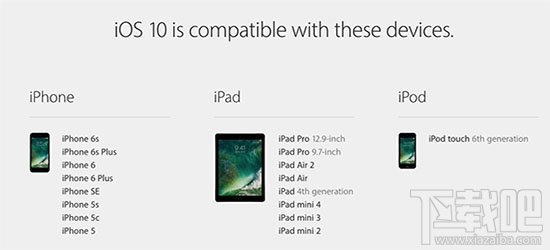 iOS 10 可升级设备一览: iPhone 系列:iPhone 6s Plus、iPhone 6s、iPhone 6 Plus、iPhone 6、iPhone SE、iPhone 5S、iPhone 5C、iPhone 5; iPad 系列:12.9 iPad Pro、9.7 iPad Pro、iPad Air 2、iPad Air、iPad mini 4、iPad mini 3、iPad mini 2、iPad 4 及其下一代; iPod 系列仅支持:iPod touch 6 及其下一代。 |