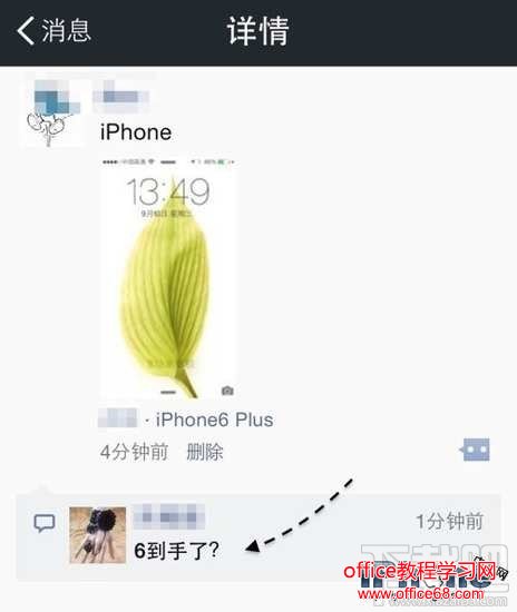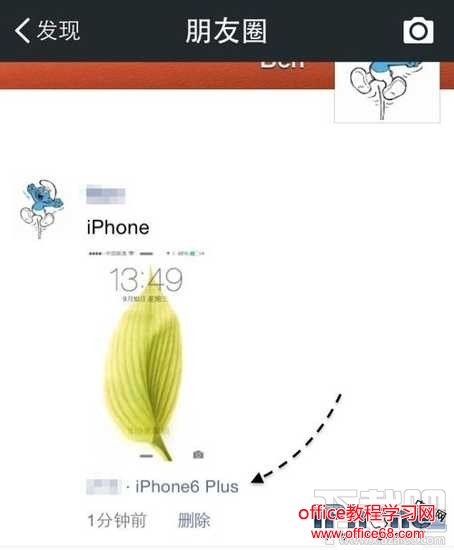 当消息发送到朋友圈之后,此时即可看到在消息下方显示一条 iPhone6 Plus 的消息,如图所示