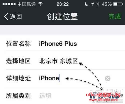 随后会出现自己创建位置的界面,在这里有二个地方必须要选择。如下图所示,可以任意选择一个地区,并写好详细地址。好了以后,点击“完成”按钮。