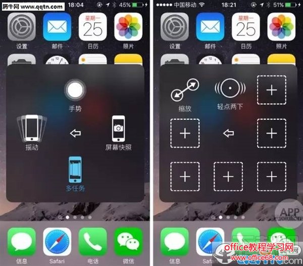 增加“多任务”“屏幕快照”两个常用功能,非iPhone 6s和iPhone 6s Plus的用户建议增添“静音”。