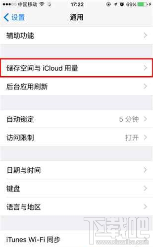 2.在通用列表中,找到【储存空间与iCloud 用量】选项,点击打开