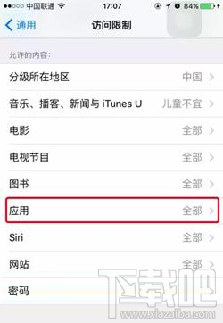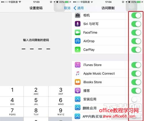 2、出现“输入访问限制的密码”的提示之后,输入访问限制密码。然后在“允许的内容”分组下面,关掉应用图标旁边的开关,即可隐藏应用。