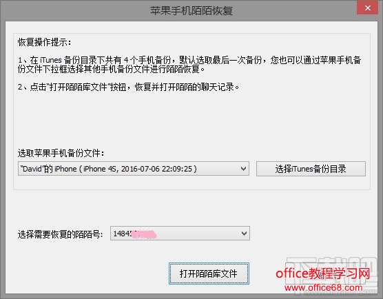 在“iTunes备份陌陌恢复”对话框中,如下图点击“打开陌陌库文件”按钮,就能查看需要恢复陌陌号的聊天记录了。如果有多个陌陌号,可以通过陌陌号的下拉框进行选择。