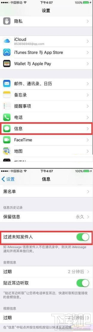 这个方法也一样,点开“设置”,进入“信息”,然后开启“过滤未知收件人”这个功能,这样就不会再收到通讯录之外的垃圾短信了。 第三招:删除邮箱联系方式