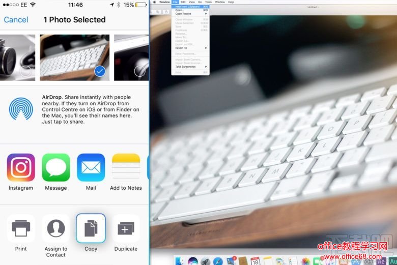 如果你想要将 iPhone 上的一张照片复制到 Mac 上,首先需要选中该照片,然后点击左下角的分享按钮,然后选择拷贝。在 Mac 上打开预览,然后点击“文件”-“从剪贴板新建”,这时候你会看到一个照片正在从 iPhone 复制到 Mac 的进度条,复制完成之后,你可以点击编辑,然后粘贴到预览。