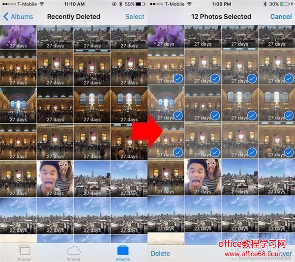 需要注意的是,从iOS 8开始,所有被删除的照片和视频将会在“最近删除”文件夹当中被继续保存30天,这种设定是为了避免用户误删照片而无法恢复。这是个很棒的创意,但它们在过期之前依然会继续占用存储空间。因此,想要一劳永逸地删掉它们,进入照片>相簿>最近删除,选择所有你不需要的照片,然后点击右下角的删除按钮即可。