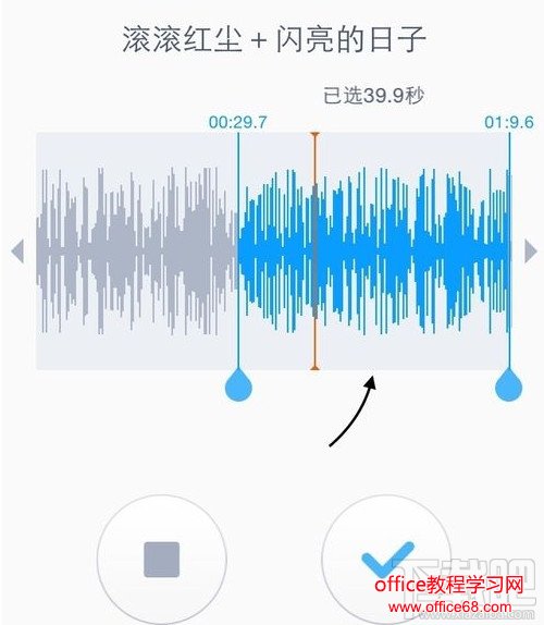 2.接着请选择“制作铃声”选项。随后进入铃声制作界面,在这里可以自己动手在歌曲中选择一段来作为铃声。铃声长度最长39.9秒,可以缩短,不能加长。好了以后点击“勾勾”完成。