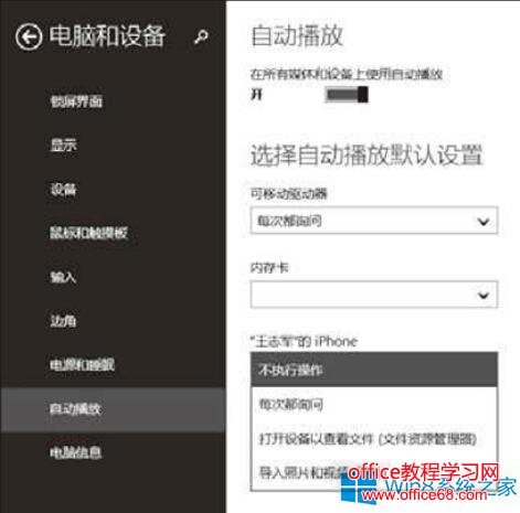 第三,在右侧窗格可以在iPhone小节下看到相关的自动播放选项,默认的播放选项一般是“每次都询问”,将其手工更改为“导入照片和视频(照片)”,更改设置之后立即就可以生效。