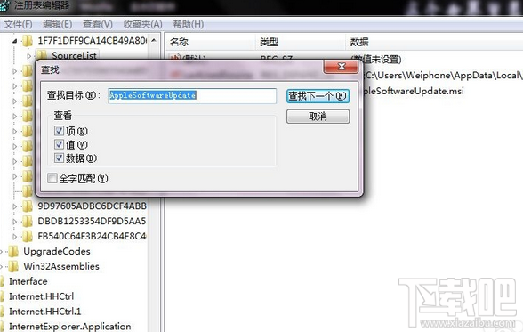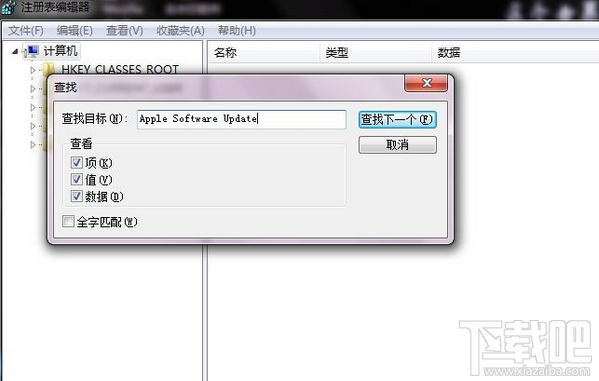 2. 使用组合键 Ctrl + F 调出搜索框,输入 Apple Software Update,并点击查找下一个,注册表编辑器右边的框里就会出现 Apple Software Update 项,我们要做的就是将该项删除。