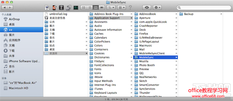 在资料库中,可以找到“Application support”文件夹,继续前往下级Mobilesync文件夹里面的backup就是备份文件所在的地方了。