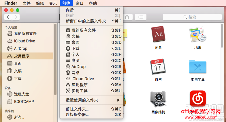 一、打开Finder,在菜单栏点击“前往”选项,按住option键会显示“资料库”,点击进入