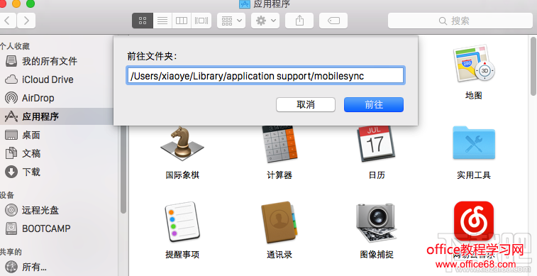 二、另外一种更加便捷的方法是在Finder下直接通过快捷键commnd+shift+G打开前往文件夹,直接复制:用户名/Library/application support/mobilesync然后回车,打开backup里面的就是了。