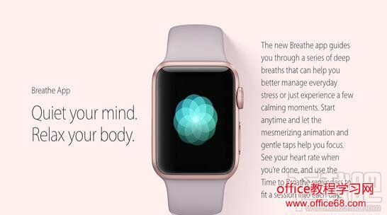 新的 Breathe 应用,设定好你想做放松呼吸的时间,手表会自动根据时间和心率来调整你的呼吸频率。