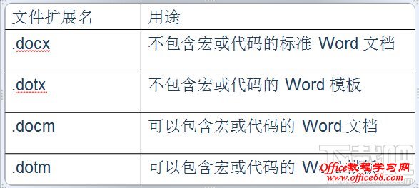Word 2007 中有四种文件类型:.docx、.dotx、 .docm 和 .dotm(“x”代表 XML,“m”代表宏)。表中列出了详细信息。