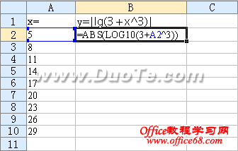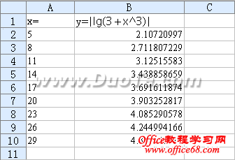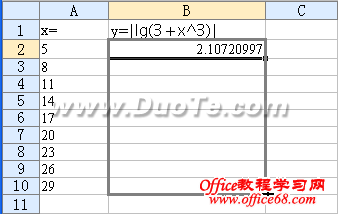 5.选中B2单元格,将鼠标移至单元格右下角,当鼠标形状变为“十字形”时,往下拖动鼠标,这时对应A列单元格中x值,都有一个y值。