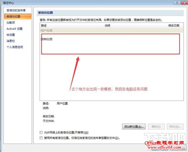 7、在“受信任的位置”选项的右侧,里面会有一些模板的,我现在的电脑没有,如果你的电脑出现这个模板,你要把它删除,无论多少个,都要删除。