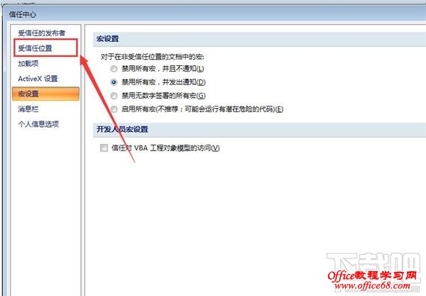 6、信任中心设置点开后,会弹出一个标题为“信任中心”的窗口,在窗口中,点击“受信任的位置”,点开后,在左侧便有我们需要的东西了!