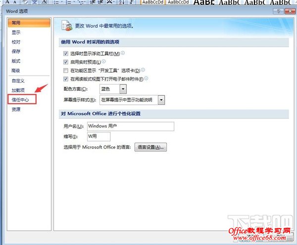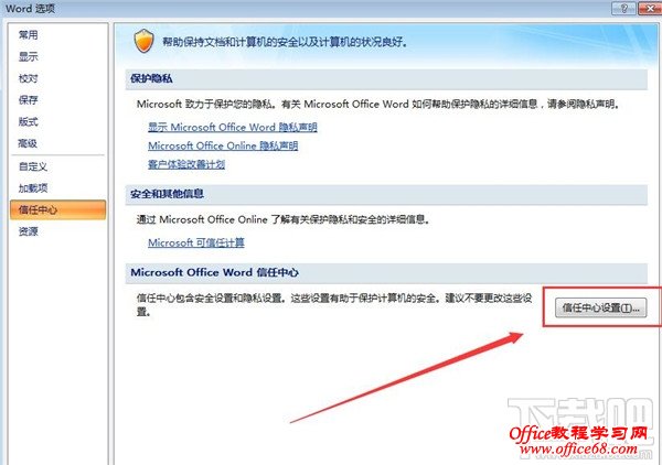 4、在“word选项”这个窗口中的右侧,点击“信任中心”这个选项。