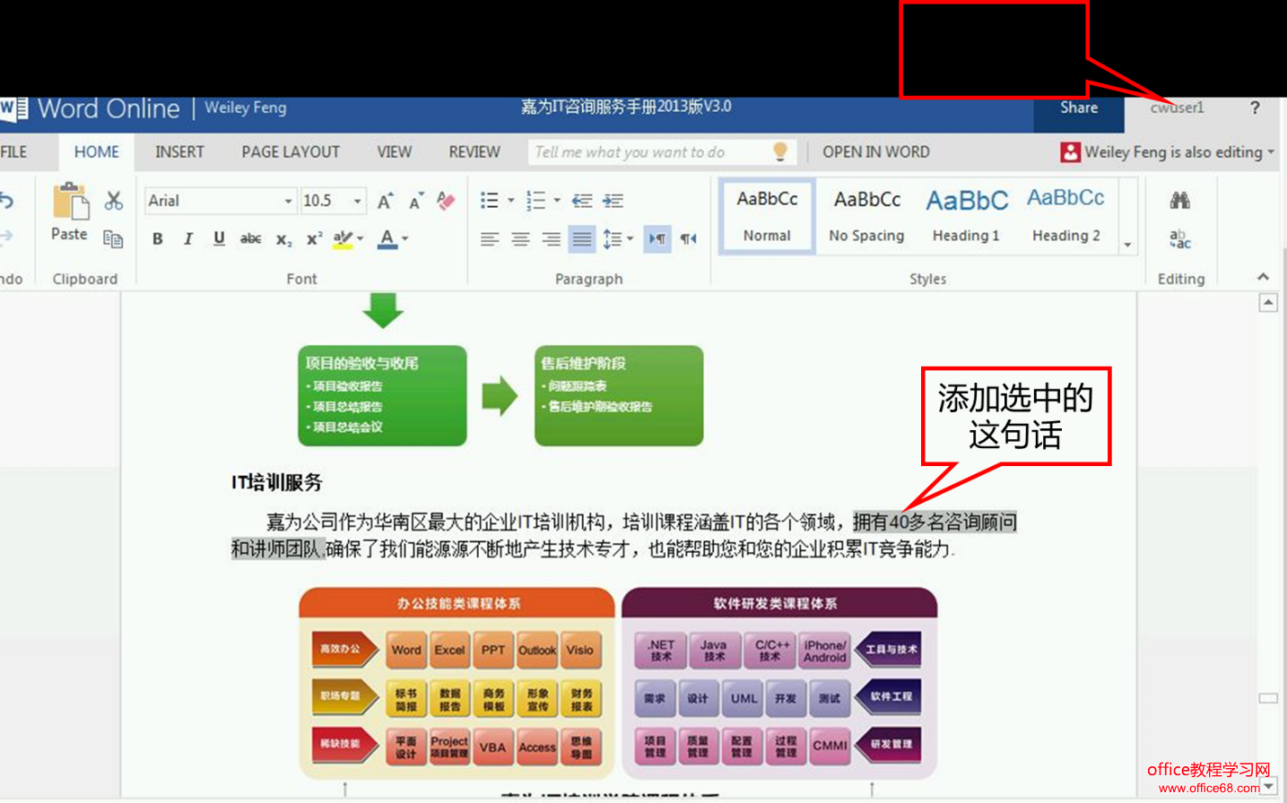 我们用Cwuser1的身份,在打开的“嘉为IT咨询服务手册2013版V3.0”文档中,添加一行字,如下: