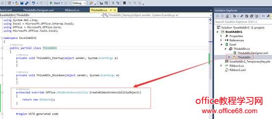 本文主要介绍如何在Office的UI界面中轻松的寻找功能模块位置,并往指定位置添加功能组及控件。 一、新建Office插件项目: 1、新建项目,如下图选择项目类型。 ![]() 2、新建Ribbon XML布局文件 ![]() 二、定位UI的特定位置(如“单元格”右边): 1、打开Excel,然后打开选项,并选择自定义功能区,如下图所示。 ![]() 2、点击新建组,然后命名为“定位组”,移动到单元格位置下,如图所示。 ![]() 3、点击“导入/到处”,然后点击“导出所有自定义设置”。 ![]() 4、将导出的文件格式更改为xml,然后用记事本打开,其中我们拿到了关键的几个定位ID(TabHome、GroupEditingExcel),如图所示。 ![]() 三、修改Ribbon布局文件,并添加按钮: 1、更改Ribbon布局文件的定位ID,如下图所示。 ![]() 2、添加自定义按钮。 ![]() 四、调试运行: 1、首先需要在插件主类文件ThisAddIn中增加如下代码段,加载我们修改好的Ribbon; ![]() 2、点击调试,会自动启动Excel,效果如下。 ![]() 【结束语】 插件的控件定位曾经让我大费周章,此方法简单有效。希望这篇文章可以让涉及者少走弯路。 |