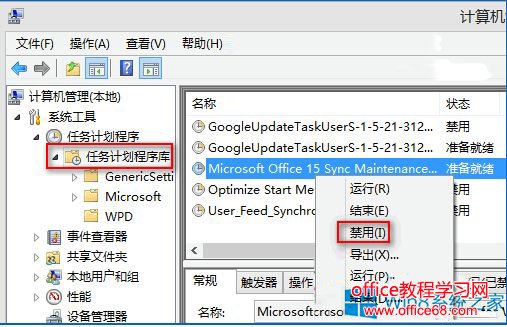 1、右键点击win8.1桌面上的“这台电脑”图标,然后选择“管理”选项; 2、在管理中打开“任务计划程序”——“任务计划程序库”,并在右侧列表中找到“Microsoft Office 15 Sync Maintenance for.。”这个计划任务; 4、在该项上点击右键,选择“禁用”即可。或者如果你确认根本就用不到Office上载中心功能,也可以选择“删除”该计划任务项。 |