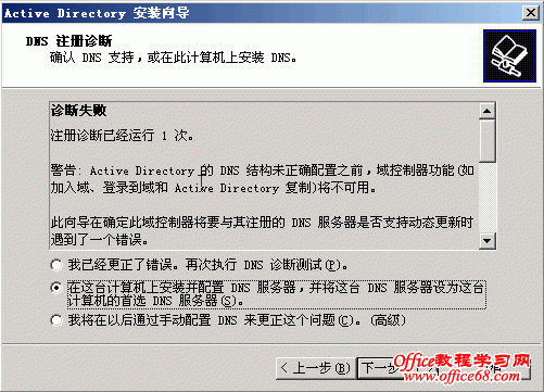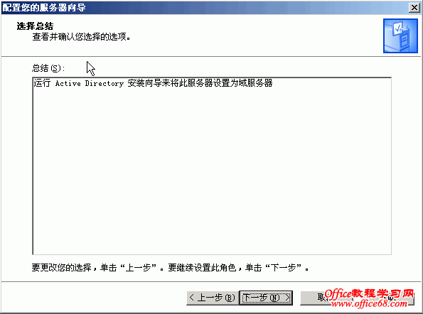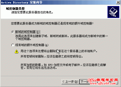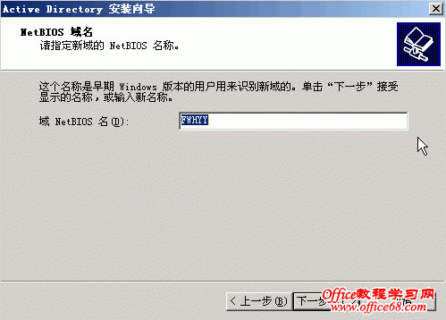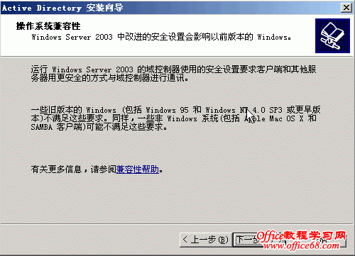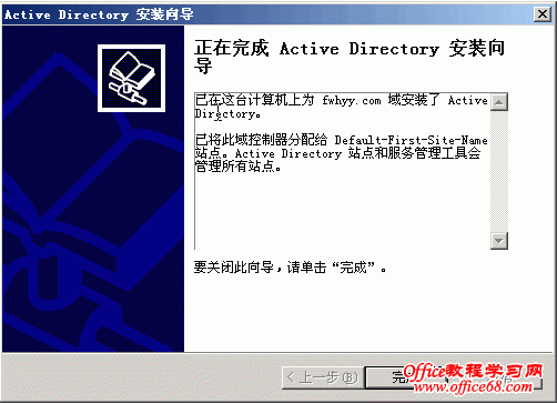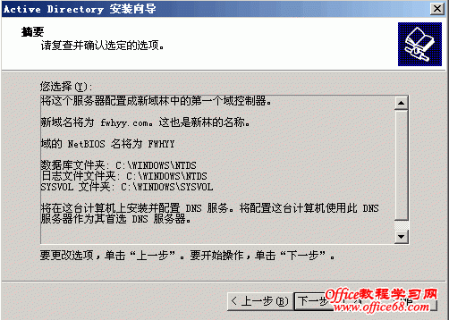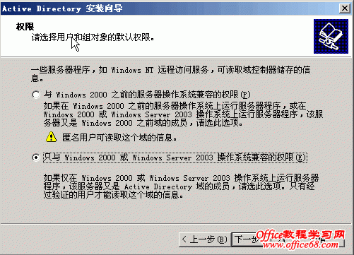 本篇将详细介绍AD(活动目录)的安装。 打开“管理您的服务器”,点击“添加或删除角色” 点击“添加或删除角色”后弹出“配置你的服务器向导”对话框 点击下一步进入如下对话框 数秒后,进入到下面视图 选择“域控制器”后点击“下一步” 点击“下一步” 随之便出现下面的对话框 点击“下一步” 继续“下一步” 选择“新域的域控制器”,点击“下一步” 选择“在新林中的域”,点击下一步 输入“新域的DNS全名”,如上图中我输入的fwhyy.com , 点击下一步 上图中的“域NetBIOS名”默认就好,一般不做修改,点击下一步 AD数据库的保存路径保持默认就好,如果需要您可以修改为你想要存放的路径,然后点击“下一步” SYSVOL文件夹的位置也不做修改,点击“下一步” 出现上图的窗口说明在安装AD前没有安装DNS,当然我们可以在之前先装好DNS再安装AD,此次安装中我选择的是选择上图对话框中的第二项,在安装AD的同时安装DNS。选择第二项后,点击“下一步” 选择“只与Windows 2000 或 Windows Server 2003 操作系统兼容的权限”,点击“下一步” 输入密码,点击“下一步” 继续“下一步”,就会开始安装了 稍等几分钟,就会出现安装成功的窗口,如下图 点击完成会弹出重启电脑的确认框 重启动脑后会弹出下面对话框,提示此服务器已是域控制器 点击“完成”就完成了AD和DNS的安装 |