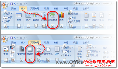 图3 借助键提示轻松完成预定任务 还需提醒用户注意的是,一次只能看到一层键提示标记,即当前所在选项卡的键提示标记。若要查看另一个选项卡的键提示,必须先移到该选项卡上。键提示的这种分层方式意味着程序中的每个命令都有唯一的键提示序列,但也意味着在比较不同选项卡的键提示时会有许多重复项。 例如,在 Microsoft Office Word 2007 中,“M”是“插入”选项卡上“SmartArt”的键提示,同时也是“页面布局”选项卡上“页边距”的键提示,如图4所示。另外,如果最终显示的是错误选项卡的键提示,则只需按【Esc】键,并再次查看选项卡的键提示标记,然后选择所需的选项卡即可。