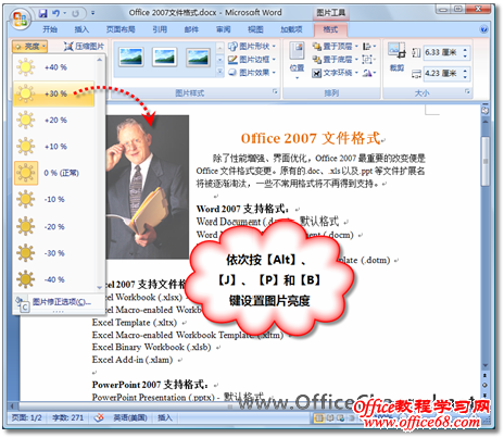 图2 显示选项卡中命令的键提示 (3)接着根据键提示按下【1】键,即可将选中的文本加粗。 (4)利用同样的方法,选中图片,然后按下键盘上的【Alt】键,再依次按下【J】、【P】和【B】键,用户便可以利用上下箭头选择不同的亮度,如图3所示,以完全脱离鼠标且无需特别记忆某组合键的方式来顺利完成预定任务。