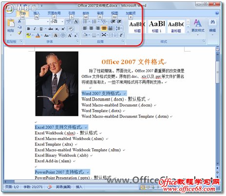 面对全新的功能区,也许很多用户都会感到陌生,但通过对它的进一步了解,相信用不了多长时间,您一定会对它爱不释手!但是,有的用户还会有另外一种担心,执行功能区中的命令是否还能够像以往一样通过键盘快捷方式来迅速完成呢? 这里,需要说明一个问题:现在键盘快捷方式分为两种基本类型,分别是用来启动命令的“组合键”和用来在屏幕的项目中导航的“访问键”。这两种键盘快捷方式的类型不同,工作方式也有所不同。其中,“访问键”可用来访问功能区,它们与您在屏幕上看到的选项卡、命令和其他内容直接相关;“组合键”可用来执行特定的命令,它们与功能区或您在屏幕上看到的其他内容无关。在Office 2007中,组合键的变化不大,其工作方式与以前相同。 下面将介绍如何使用访问键在功能区中导航。在使用访问键(而非鼠标等指针设备)控制功能区和屏幕上的其他内容时,必须首先“打开”对功能区的键盘控制。换言之,您需要离开文本输入模式而进入命令模式,这可以通过按【Alt】键来实现。 例如,如果用户希望通过访问键来为文本加粗,并更改图片的亮度,可以执行以下操作步骤: (1)选中文档中需要加粗的文本,然后按下键盘上的【Alt】键,进入命名模式。此时功能区中会立即出现小标签(称为标记),以显示所有选项卡的命令的键提示,如图1所示。