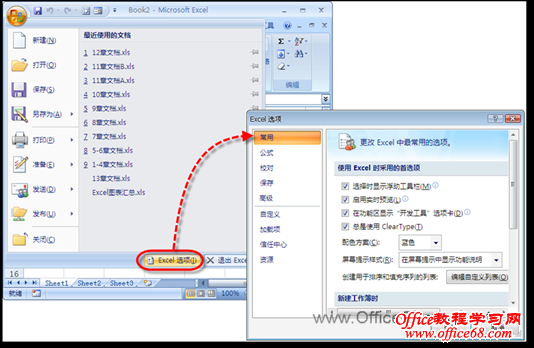 为了在意外发生时,把用户的损失降至最小,Office 2007提供了“自动保存”的功能,并且用户可以根据个人需要,自由更改“自动保存”的相关设置,例如,更改自动保存的文件格式、缩短自动保存的时间、更改自动恢复文件位置、更改文件默认保存位置等。 在Office 2007中,通过使用“程序名称选项”对话框,即可轻松更改“自动保存”相关设置。以Excel 2007为例,具体操作步骤如下。 (1)在Excel 2007工作薄中,单击【Office按钮】,在随即打开的下拉列表中,单击【Excel选项】按钮,打开“Excel选项”对话框,如图1所示。