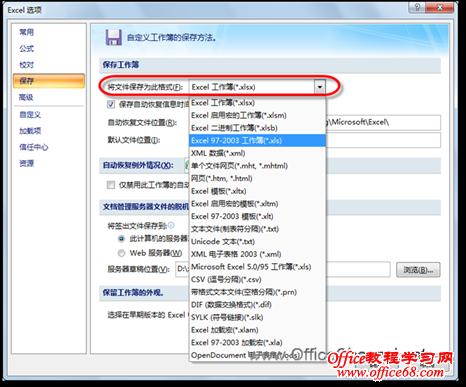 图2 “保存”选项卡 (3)在“将文件保存为此格式”下拉列表框中,列出了所有可用的文件保存格式,用户可根据需要进行选择(如图3所示)。如选择“Excel 97—2003 工作薄”,这样在保存工作薄时,无需执行【另存为】命令,而直接执行【保存】命令,就可将其保存为“.xls”格式,而不再是Excel 2007的“.xlsx”格式了。