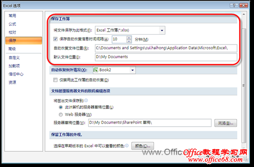 图1 打开“Excel选项”对话框 (2)在对话框中切换到“保存”选项卡,在其“保存工作薄”选项区域中即可更改相关设置,如图2所示。