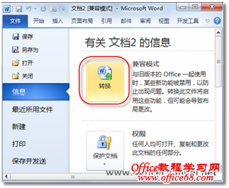 图4 兼容模式 为了在编辑文档时,能够使用Microsoft 2010提供的所有新功能,应该将其转换为最新的Microsoft 2010的格式。 3. 再次单击【文件】按钮打开后台视图,然后在“信息”视图中单击【转换】按钮,即可将当前文档更改为Microsoft 2010的格式,如图5所示。