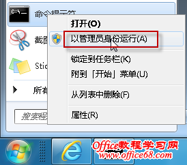 从开始菜单找到“命令提示符”,右击选择“运行身份”。然后使用管理员账户打开。