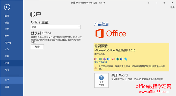 1. 任意打开一个Office文档,点“文件”-“账户”,就会在右侧发现:“此产品未经授权”,需要激活。