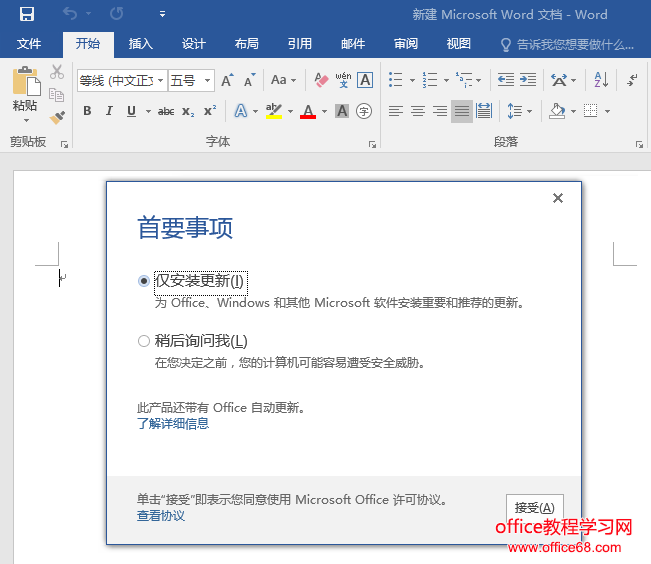 6. 在桌面右键,任意新建一个Offcie文档(如Word),并打开,会出现下图提示:(点“接受”)