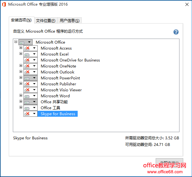 4. 下图仅供参考,只安装了“办公三剑客”:Word + Excel + PPT. 大家可以根据实际情况,在“安装选项”中关闭自己不需要的功能;还可以在“文件位置”中,指定安装位置。