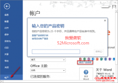 有时候我们需要更换一下Office2013的产品密钥,下面 Microsoft酋长 介绍一下Office2013更换产品密钥的方法步骤: 最简单的方法就是打开Office2013办公套件中的任意一个组件,例如Word2013,然后点击文件菜单,选择帐户选项卡。如图: 你会看到产品信息区域有一个更换产...