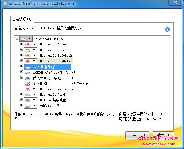 二、准备工作 接下来,我们需要用到工具是 Office 2010 的一个组件:OneNote. 1. 没有安装 Office 2010 的同学,请先下载安装:Microsoft Office 2010专业增强版. 2. 安装了 Office 2010 却没有 OneNote 的同学,可以依次点击:控制面板---卸载程序,找到 Office 2010 并右键,更改---添加或删除功能,找到OneNote,选择“从本机运行”,继续,等待配置完成。