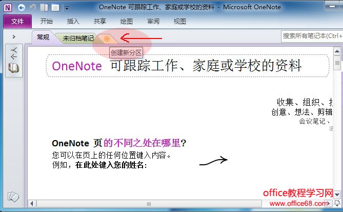 三、开始转换 1. 当安装或配置完成后,我们可以很容易地在开始按钮“所有程序”里找到“Microsoft Office”文件夹,进而找到并打开OneNote。 2. 打开后,点击标签页菊花按钮,“创建新分区”,如下图:
