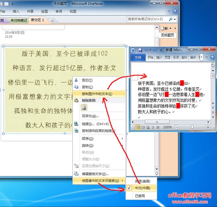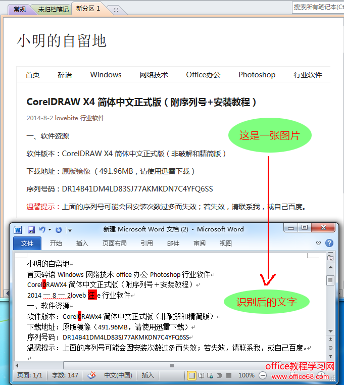4. 以上已经完成了PDF到Word转换的所有步骤,原理其实就是利用了 OneNote 2010 的OCR识别功能(Optical Character Recognition,光学字符识别)。因此,OneNote不仅可以用来转换PDF为Word,甚至还可以将图片中的文字识别到Word。下图就是将一篇本站文章的截图转换到Word:(标红为转换错误)
