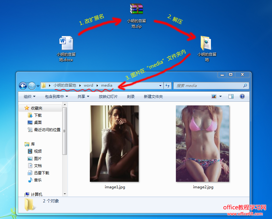 第二种:修改扩展名 *此方法不适用于Office 2003,适用于2007及之后的版本。(因为 .docx 等 以 x 结尾 的文档,才是压缩文档,文件体积也偏小。) 将Office文件扩展名改成.zip,然后解压即可。例如,将“的自留地.docx”重命名为“的自留地.zip”,然后解压,图片就在media文件夹。(个人认为这种方法最为简单。)