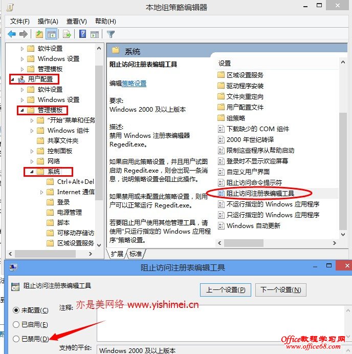 依次找到“用户配置” - “管理模版” - “系统”,然后鼠标单击“系统”,在右边窗口中找到“阻止访问注册表编辑工具”,双击打开后,勾选“已禁用”确定即可。