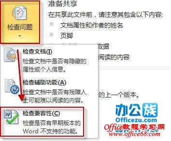 兼容性检查 兼容性检查器会自动运行。如果想知道文档中是否存在与早期版本不兼容的功能,也可以手动运行兼容性检查器。单击“文件”,指向“检查问题”,然后单击“检查兼容性”。