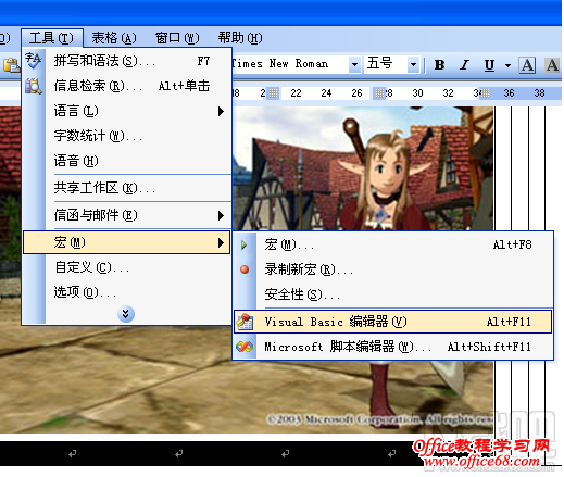 在停止了录制之后,我们可以选择“工具”菜单→“宏”菜单→“Visual Basic 编辑器”菜单,来编辑查看我们刚才录制的“宏”
