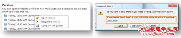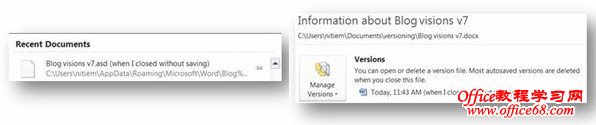 如果文档遭遇意外未保存就别关闭的话,程序会将最后一个的自动保存点显示在Backstage view下的Recent Documents里,这样你就很容易恢复到最后一次自动保存的状态,这只需要在菜单里点几下鼠标即可实现。另外,你也可以从文档信息里找到这个最近的自动保存点。