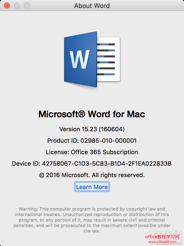 在mac上打开office软件word,点击左上角 about word,找到【Learn More】,点击即可查看。