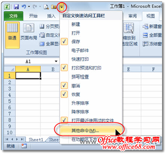 1. Excel 2010的“快速访问工具栏”中,单击【自定义快速访问工具栏】按钮,并执行下拉列表中的【其他命令】命令,如1所示。