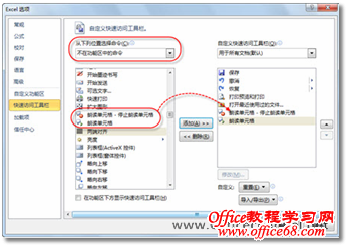 2. 在随即打开的“Excel选项”对话框中,从“从下列位置选择命令”列表中,选择“不在功能区中的命令”,并在下方的列表框中向下滚动,找到要使用的“朗读单元格”和“朗读单元格-停止朗读单元格”命令,分别单击【添加】按钮,将这些命令添加到右侧的列表框中,如2所示。